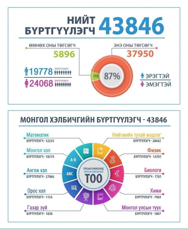 ЭЕШ энэ сарын 16-нд буюу ирэх долоо хоногийн бямба гарагт Монгол хэлбичгийн шалгалтаар эхэлнэ. Энэ онд нийт 43,846 шалгуулагч ЭЕШ-д бүртгүүлснээс 87 хувь нь буюу 37,950 нь энэ жилийн төгсөгч, 5,896 нь өмнөх оны төгсөгч байгаа юм.