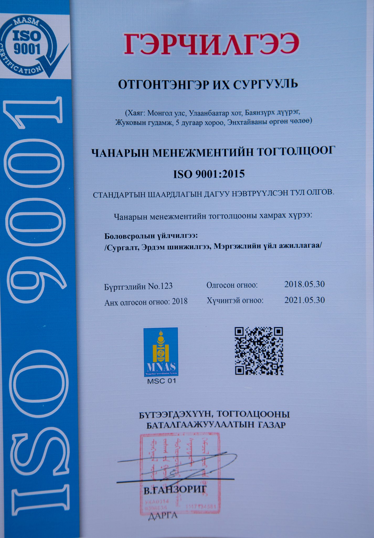 Отгонтэнгэр их сургууль өнөөдөр Засгийн газрын хэрэгжүүлэгч агентлаг Стандарт хэмжилзүйн төвөөс олон улсын ISO9001:2015 стандартын гэрчилгээгээ гардаж авлаа. Хувийн хэвшлийн их сургуулиудаас анх удаа үндэсний стандарт хэмжилзүйн газраар баталгаажуулалт хийлгүүлэн аудитад тэнцэж ISO9001:2015 сертификат авснаар Монгол улсын дээд боловсролын байгууллагуудаас чанарын менежментийг амжилттай нэвтрүүлсэн үндэсний жишиг сургуулиудын нэг боллоо.
