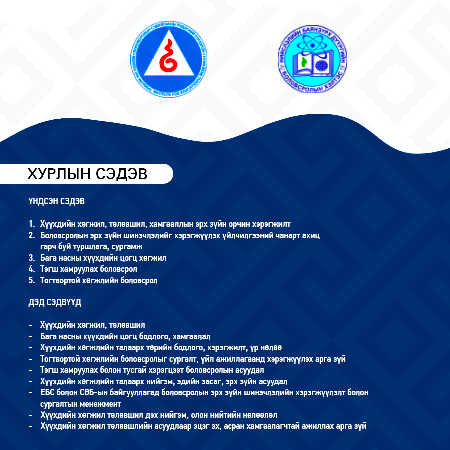 • Тогтвортой хөгжлийн боловсролыг сургалт, үйл ажиллагаанд хэрэгжүүлэх арга зүй