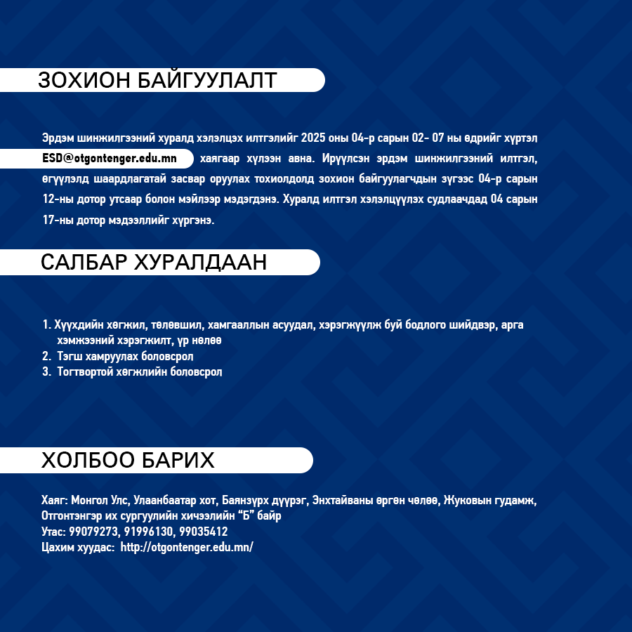 Эрдэм шинжилгээний хуралд хэлэлцэх илтгэлийг 2025 оны 04-р сарын 02- 07 ны өдрийг хүртэл esd@otgontenger.edu.mn хаягаар хүлээн авна. Ирүүлсэн эрдэм шинжилгээний илтгэл, өгүүлэлд шаардлагатай засвар оруулах тохиолдолд зохион байгуулагчдын зүгээс 04-р сарын 12-ны дотор утсаар болон майлээр мэдэгдэнэ. Хуралд илтгэл хэлэлцүүлэх судлаачдад 04 сарын 17-ны дотор мэдээллийг хүргэнэ.