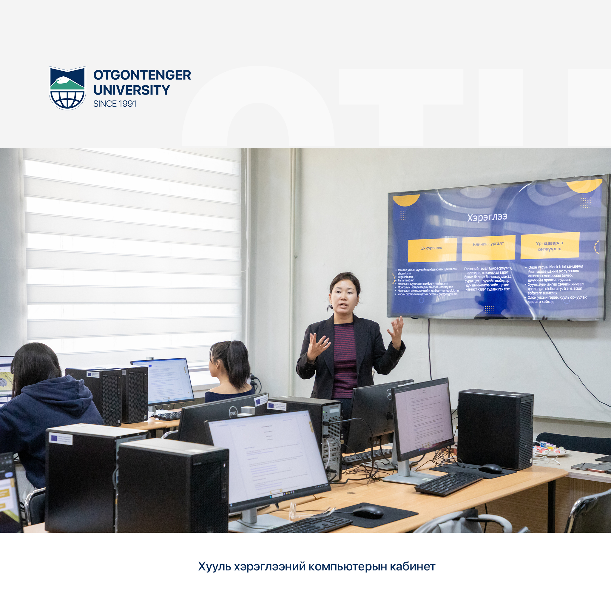 Мөн хууль хэрэглээний компьютерын кабинетыг байгуулсан нь хууль хэрэглээний практик цахим хэрэглэгдэхүүний тусламжтай хичээлийг илүү үр дүнтэй явуулах, хуульчийн сонгон шалгаруулалтад төгсөгчдөө бэлтгэх, төгсөх шалгалтыг цахимаар авах зэрэг олон талын ач холбогдолтой шийдэл болж байна.