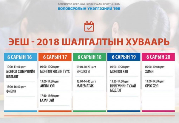 ЭЕШ энэ сарын 16-нд буюу ирэх долоо хоногийн бямба гарагт Монгол хэлбичгийн шалгалтаар эхэлнэ. Энэ онд нийт 43,846 шалгуулагч ЭЕШ-д бүртгүүлснээс 87 хувь нь буюу 37,950 нь энэ жилийн төгсөгч, 5,896 нь өмнөх оны төгсөгч байгаа юм.