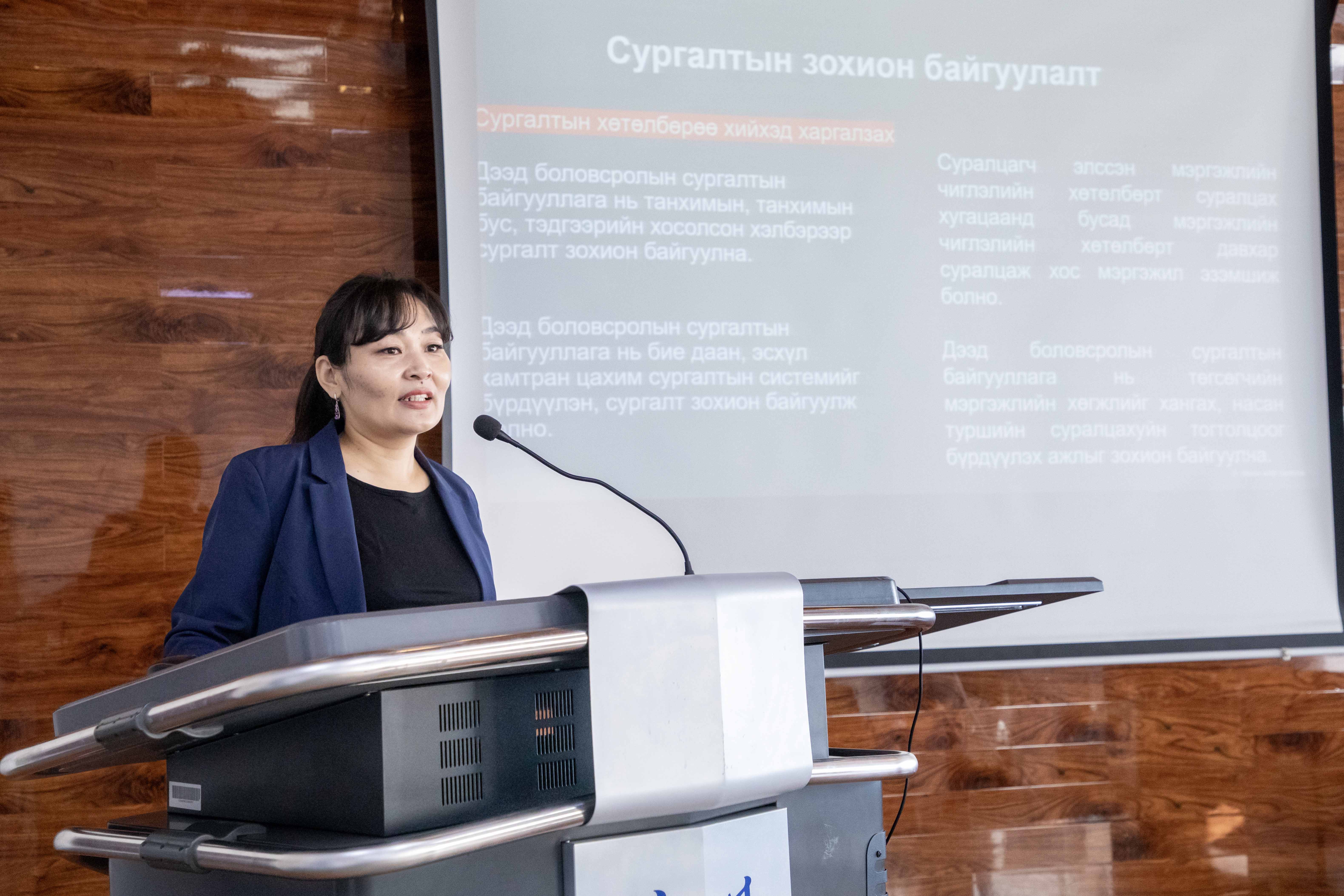 Энэ удаагийн сургалтыг Хууль зүйн сургуулийн багш нар хамтран дараах агуулгын хүрээнд Боловсролын ерөнхий хууль, Дээд боловсролын тухай хуулийн хэрэгжилт болон байгууллагын зорилго зорилтын хүрээнд багшийн заах арга зүй сэдвийн хүрээнд багтсан юм. Мөн МLC Business school байгууллагын ахлах багш Төрбат "Сургалтыг үр дүнд хүргэх илтгэх чадвар" сэдвээр сургалт орлоо.