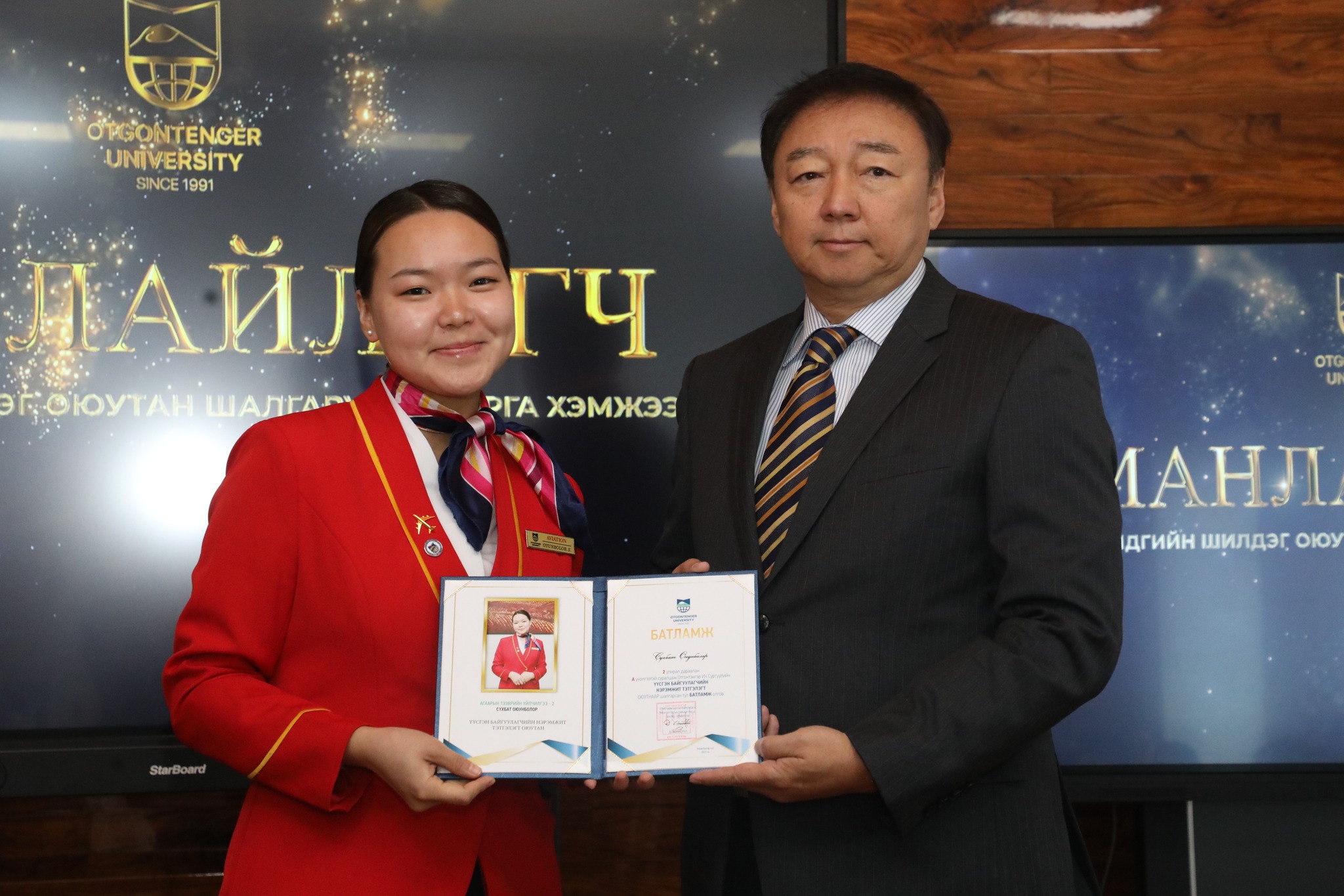 Манлайлагч удирдагч оюутнаар Агаарын тээврийн үйлчилгээний ангийн оюутан А.Хажидцогзол, Бизнесийн удирдлагын ангийн оюутан А.Урангоо,