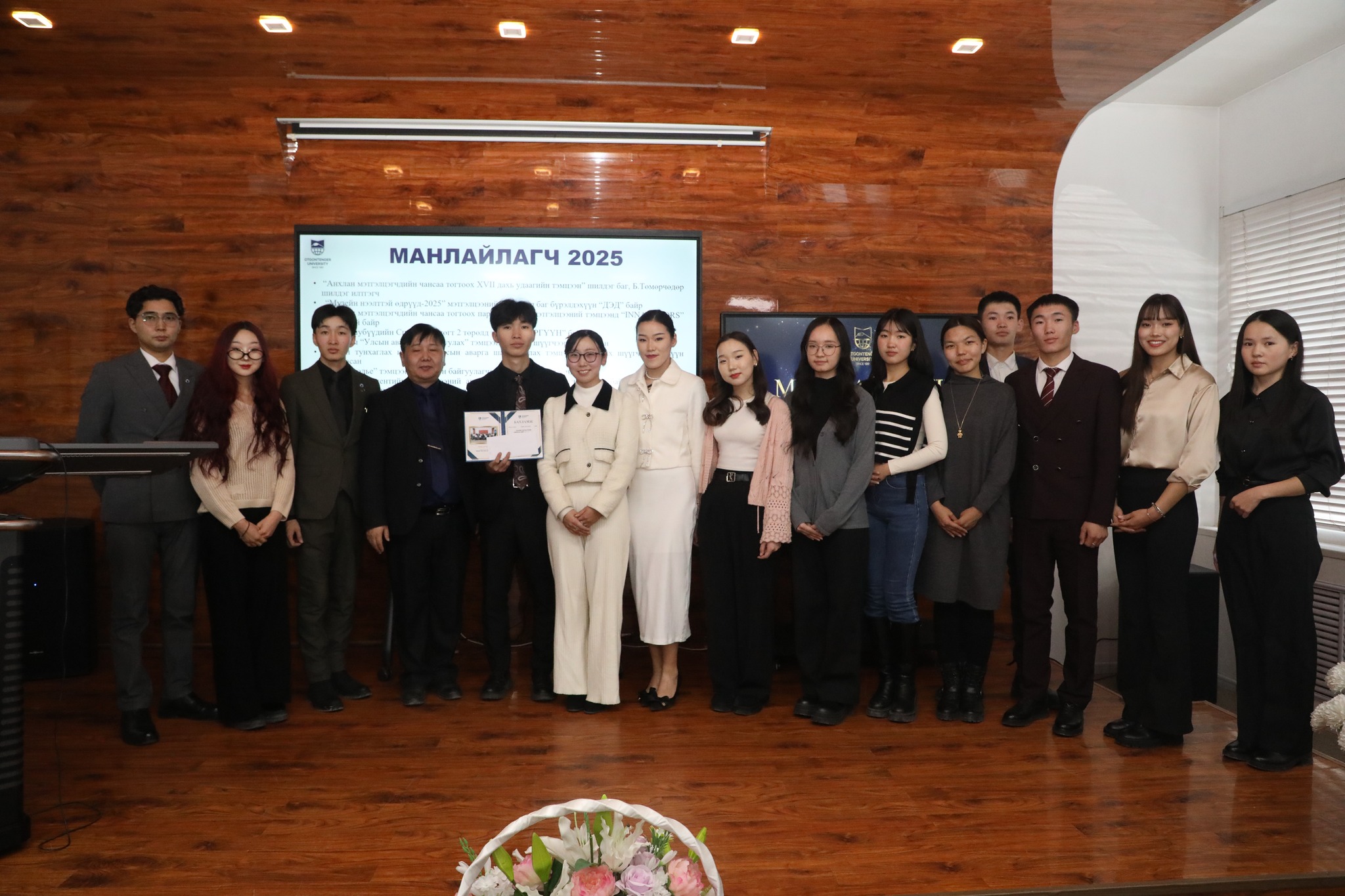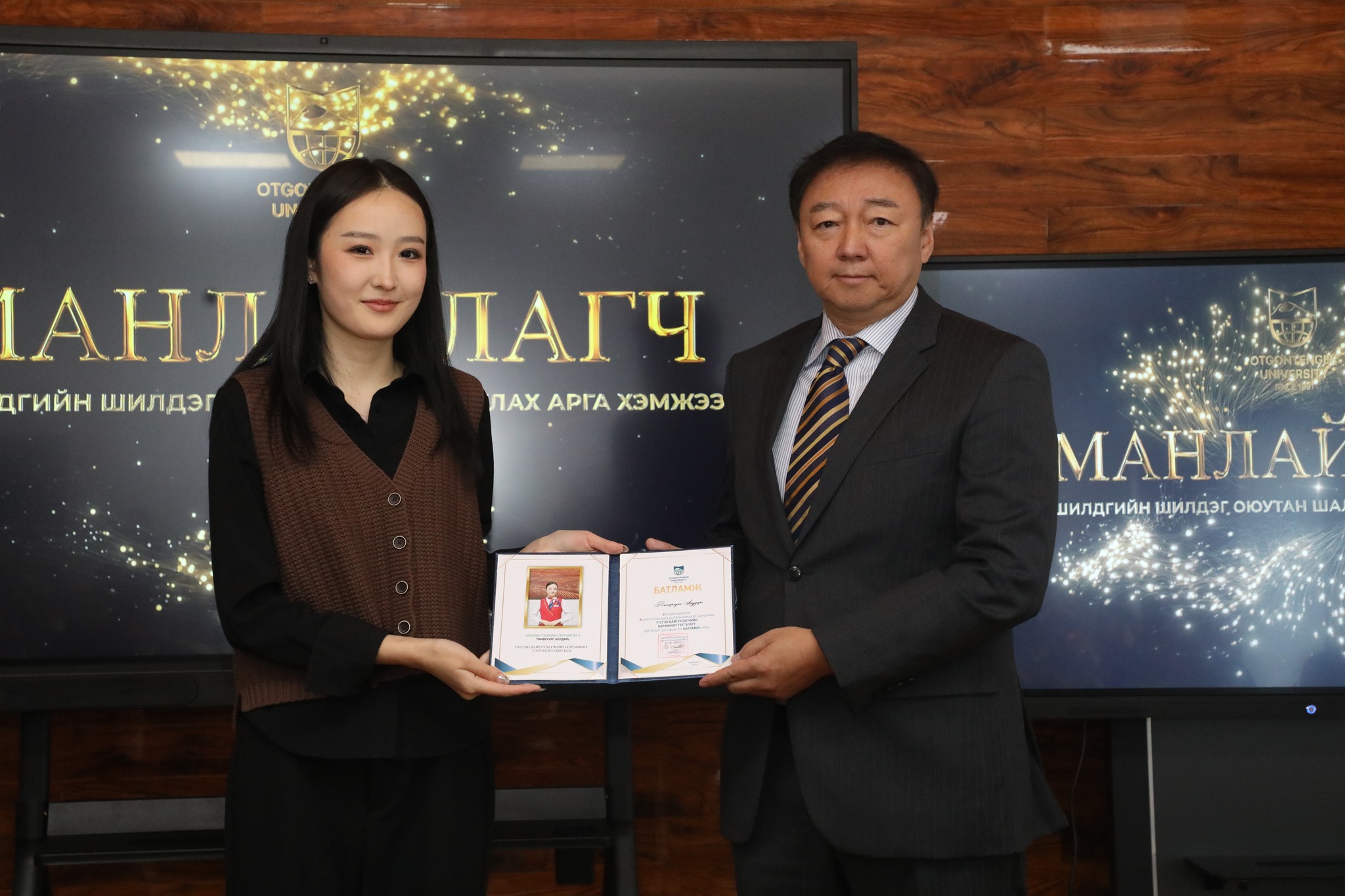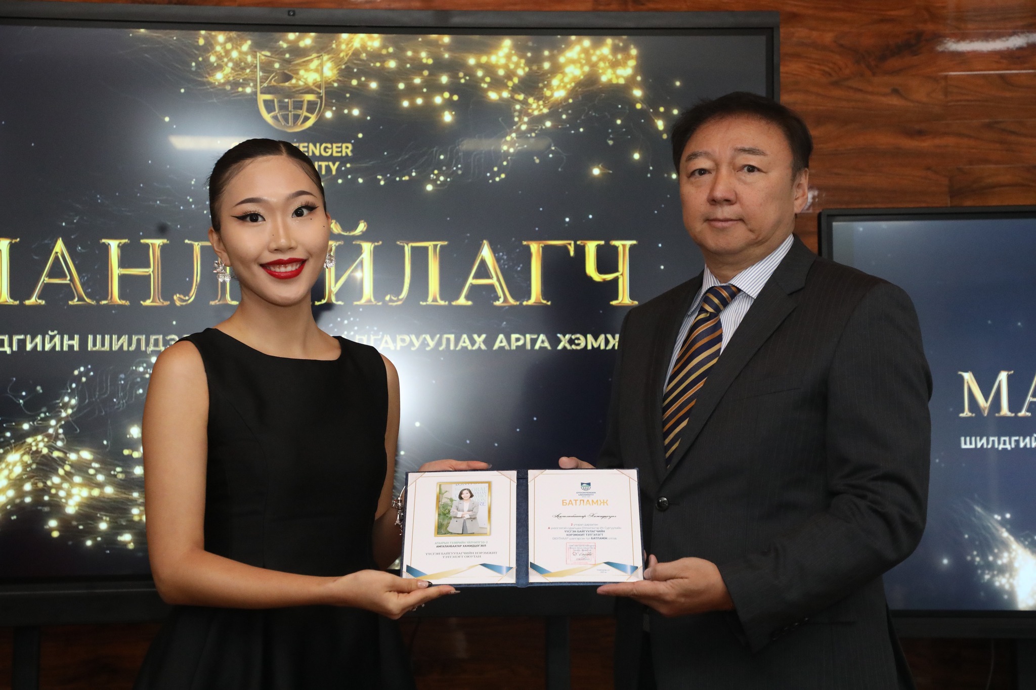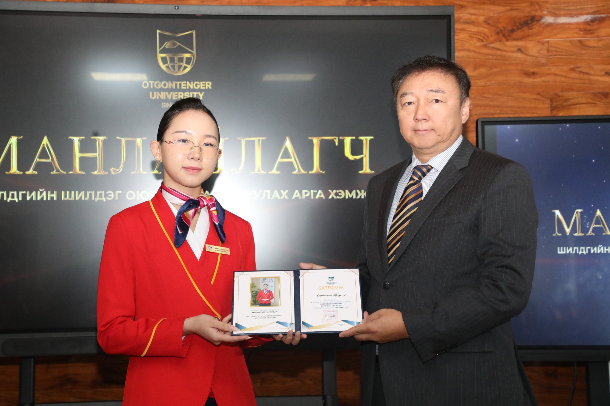Манлайлагч тэргүүний оюутнаар ОУ-ын харилцааны ангийн оюутан Ч. Хүчитбаатар, Эрх зүйн ангийн оюутан Г.Нямтунгалаг