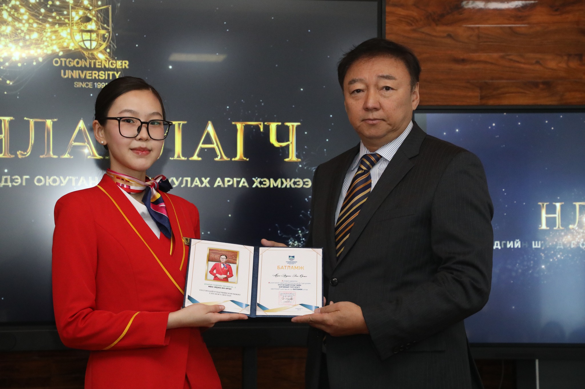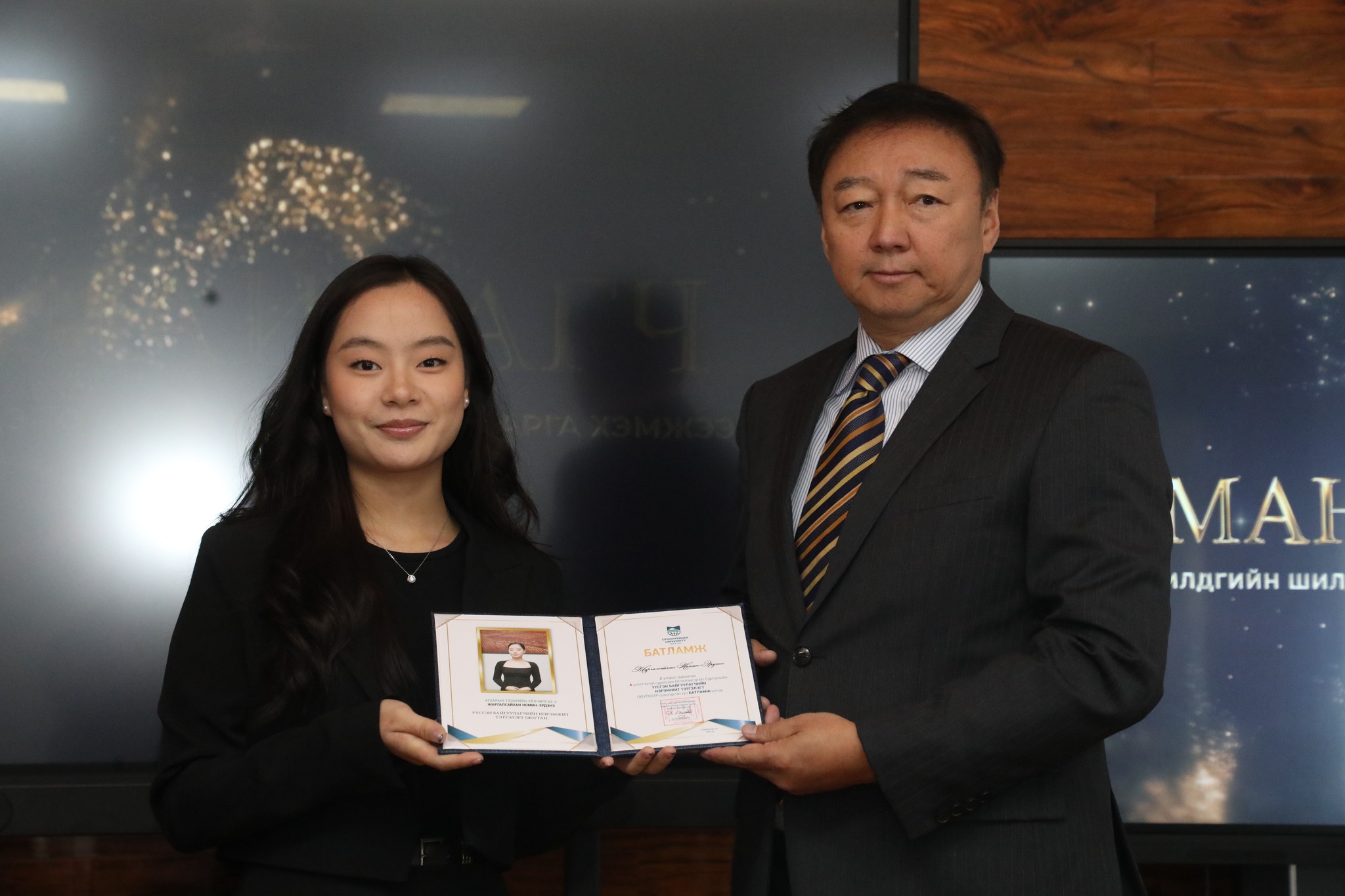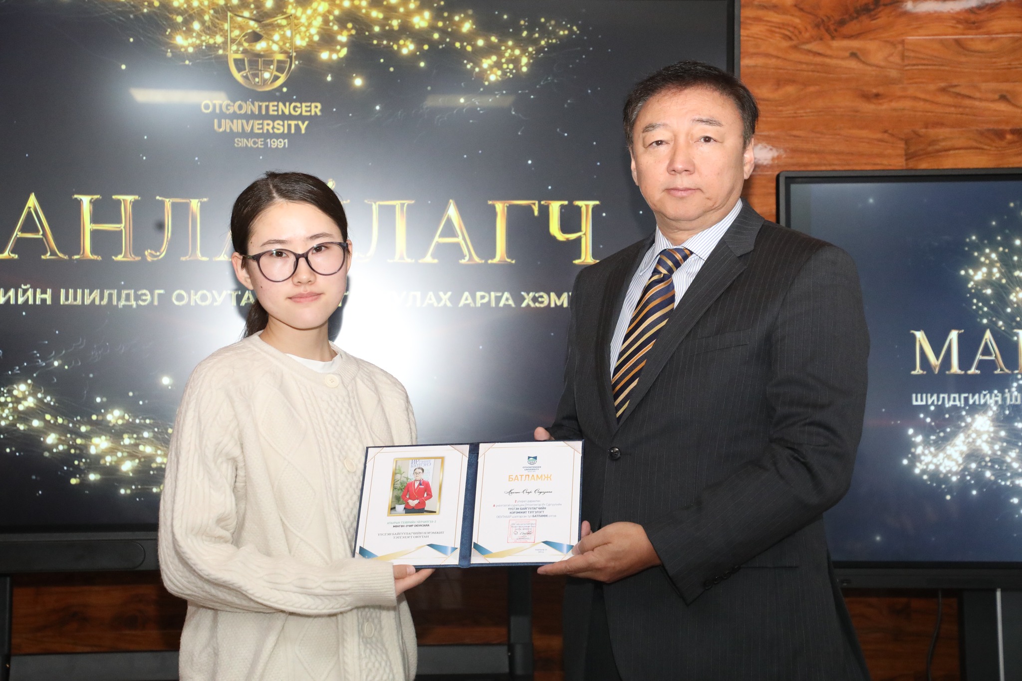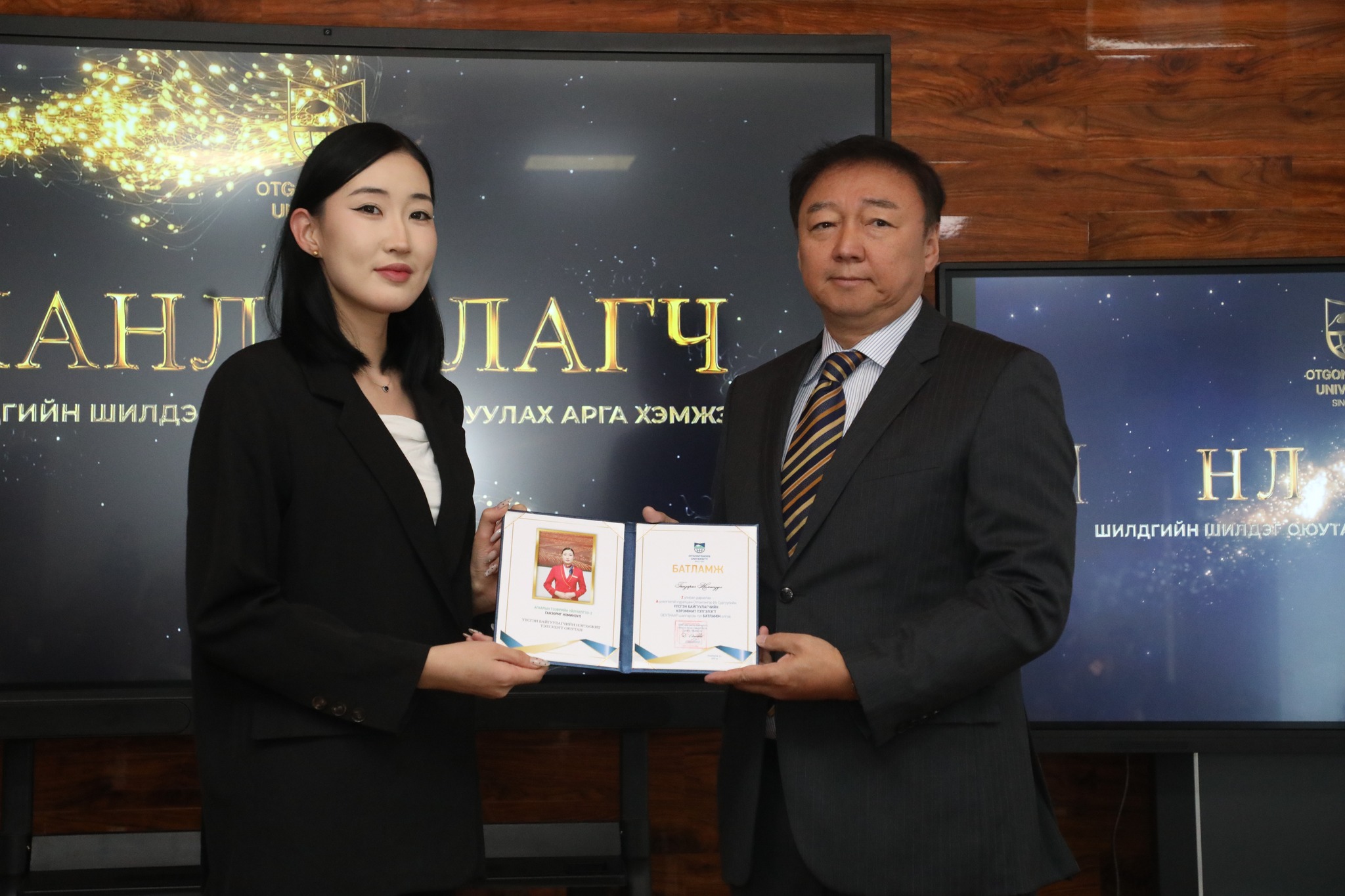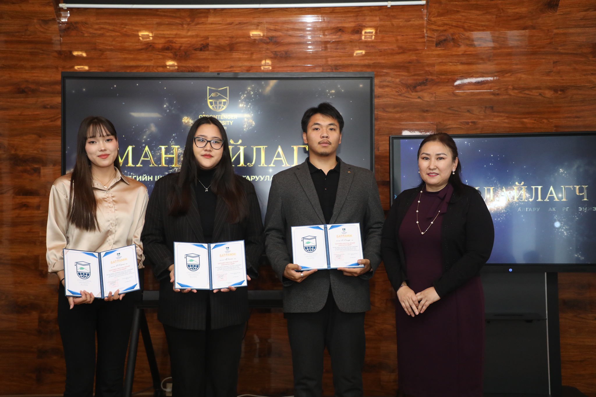 Манлайлагч тэргүүний оюутнаар ОУ-ын харилцааны ангийн оюутан Ч. Хүчитбаатар, Эрх зүйн ангийн оюутан Г.Нямтунгалаг