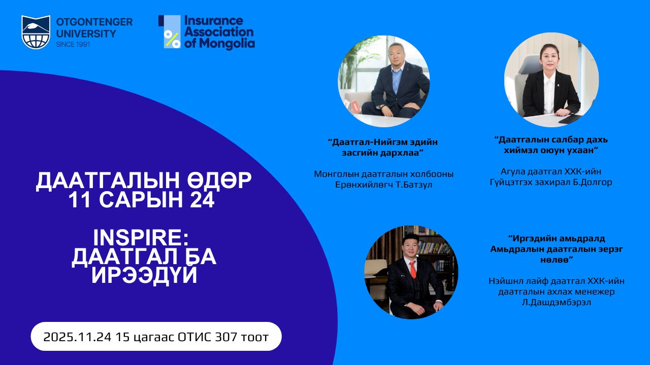 Хэлэлцүүлэгт Монголын даатгалын холбооны Ерөнхийлөгч Т.Батзул, Агула даатгал ХХК-ийн Гүйцэтгэх захирал Б.Долгор, Нэйшнл лайф даатгал ХХК-ийн даатгалын ахлах менежер, Л.Дашдэмбэрэл, Бизнесийн удирдлага хөтөлбөрийн оюутнууд илтгэл хэлэлцүүлнэ. Та бүхэн хүрэлцэн ирж сонирхолтой илтгэлүүдтэй танилцаарай.