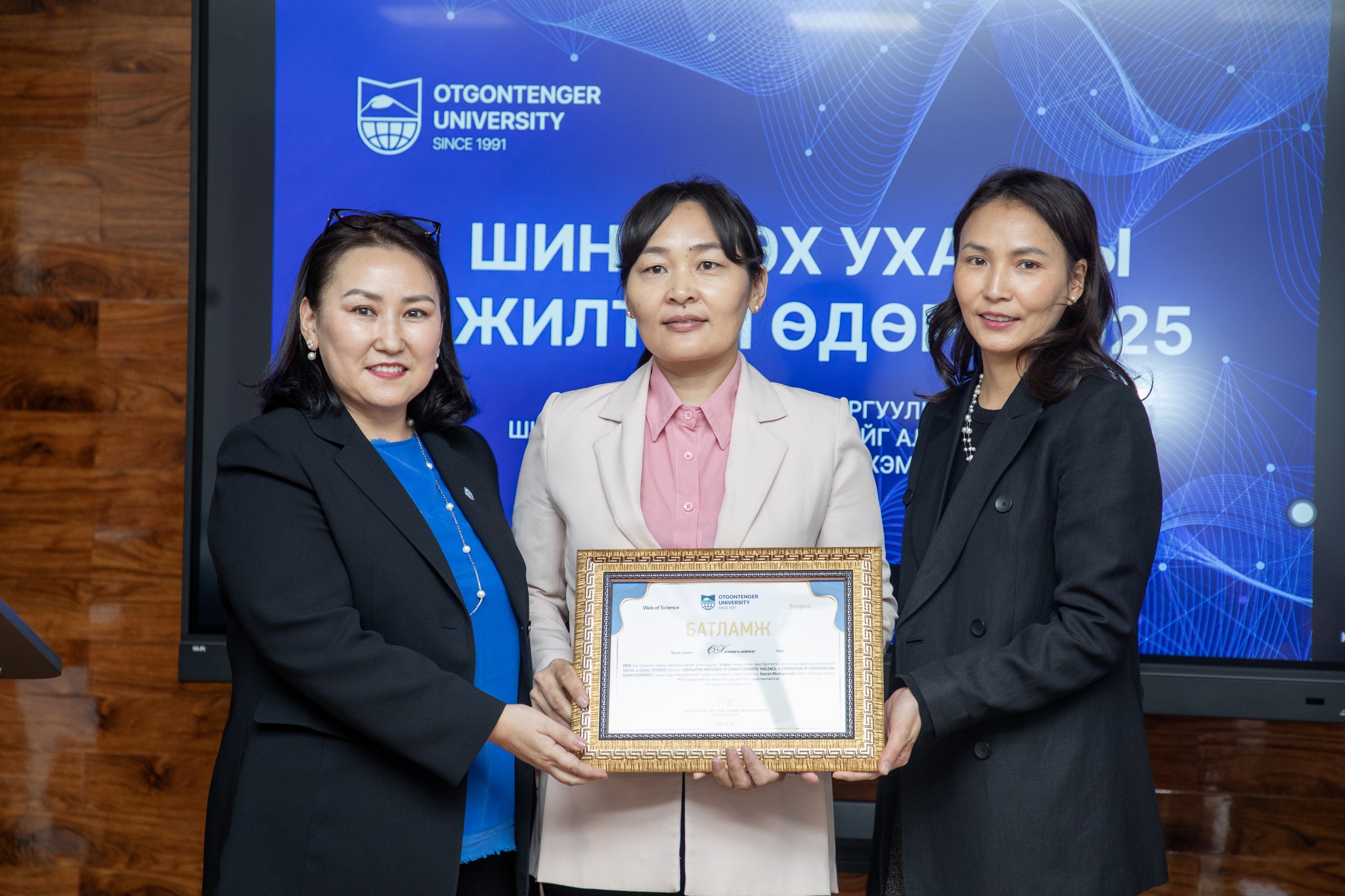 Отгонтэнгэр Их Сургууль энэ хичээлийн жилээс “Шинжлэх ухааны ажилтны өдөр”-ийг албан ёсоор ёслон тэмдэглэж, ОТИС-ийн шилдэг судлаач эрдэмтдийг алдаршуулах хүндэтгэлийн арга хэмжээ зохион байгууллаа.Тус арга хэмжээний хүрээнд ОТИС-иин WoS, SCOPUS-т нэг ба холбоо баригч зохиогчоор өгүүлэл хэвлүүлсэн 6 багшид Хүндэтгэлийн цом, хамтарсан өгүүлэл хэвлүүлсэн 7 судлаач багшид Батламж гардууллаа.