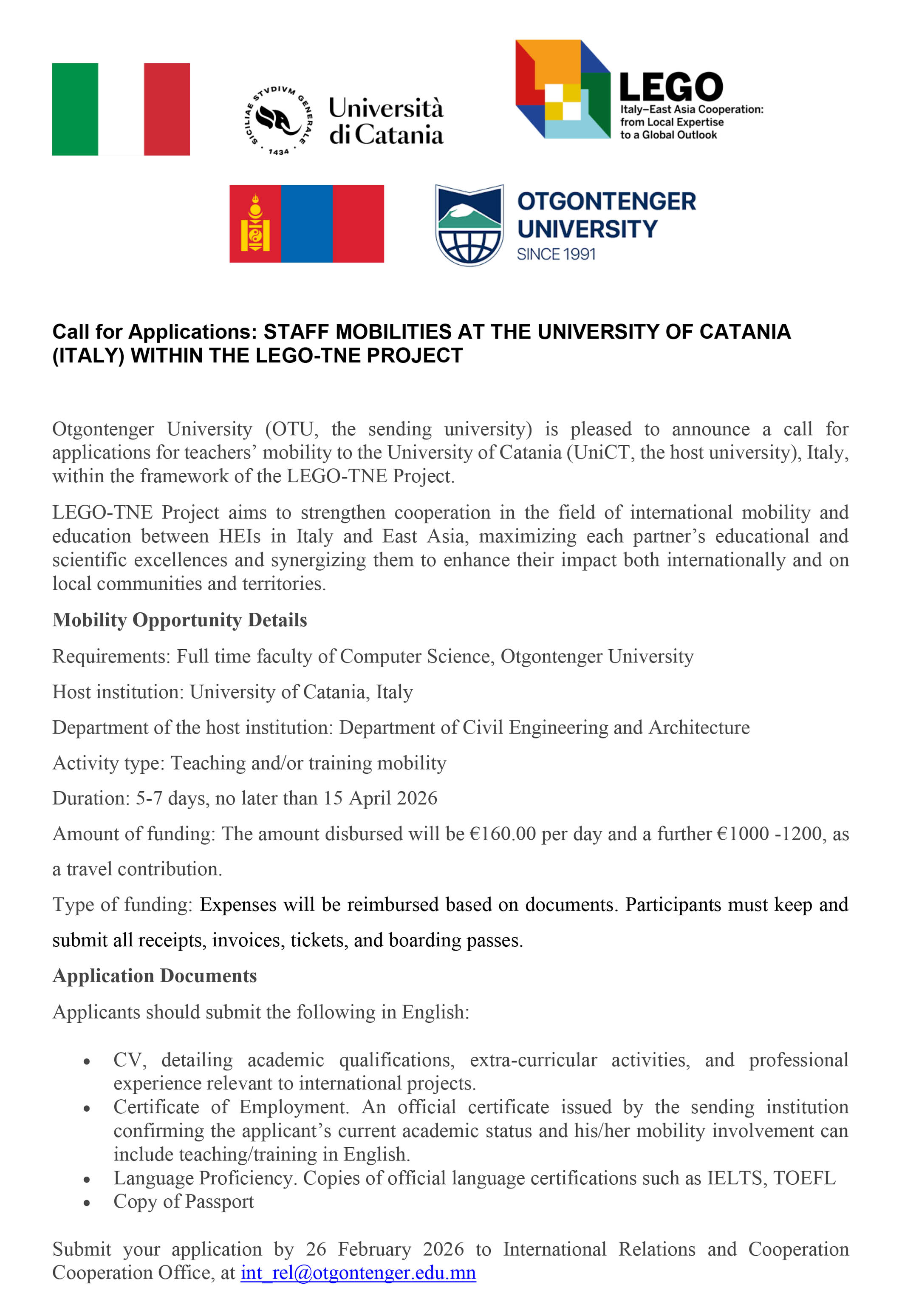 Mobility Opportunity Details Requirements: Full time faculty of Computer Science, Otgontenger University Host institution: University of Catania, Italy Department of the host institution: Department of Civil Engineering and Architecture Activity type: Teaching and/or training mobility Duration: 5-7 days, no later than 15 April 2026