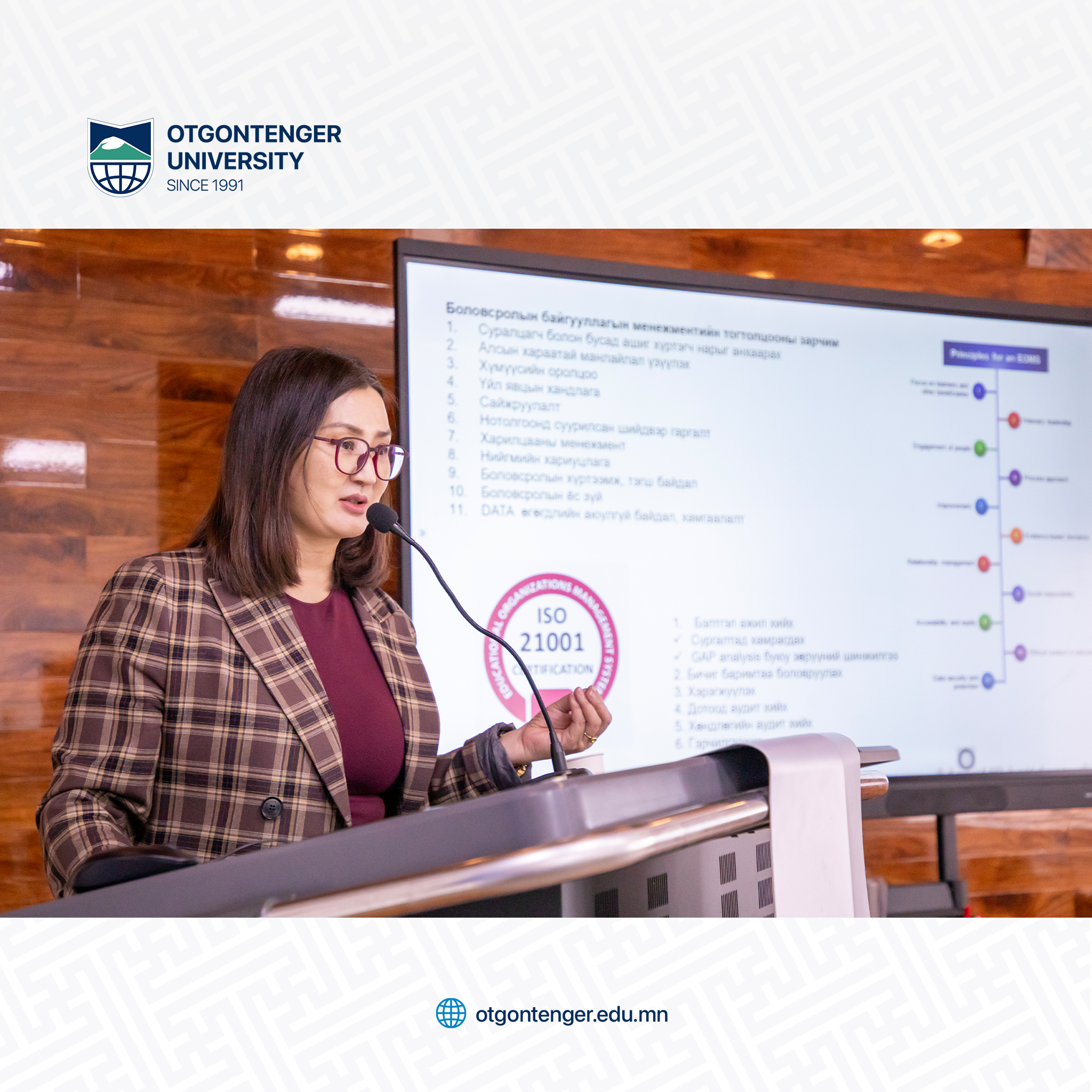 Энэхүү зорилгын хүрээнд менежментийн тогтолцоогоо олон улсын түвшинд хүргэх, байгууллагын соёлыг төлөвшүүлэх зорилгоор "Боловсролын байгууллагын менежментийн тогтолцоо" буюу MNS ISO 21001:2021 стандартын сургалтыг нийт ажилтан, албан хаагчдынхаа дунд зохион байгууллаа.